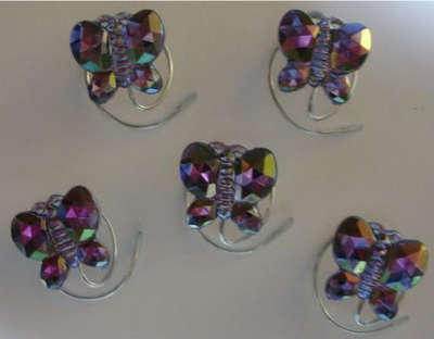 You are bidding on 5 amazing hair swirls consisting of beautiful sparkling purple acrylic butterflies with an aurora borealis finish. They are attached to a sturdy silvertone, tarnish resistant wire. Each one measures 3/4 of an inch. They give off a dazzling shine when light hits them. I guarantee it or your money back. This item cannot be sampled but if you are not satisfied for any reason you may return it for a full refund. Please check out my other auctions as i have many different designs and colors.
