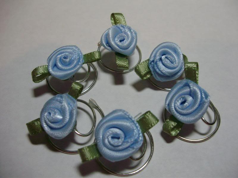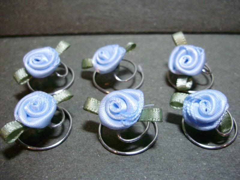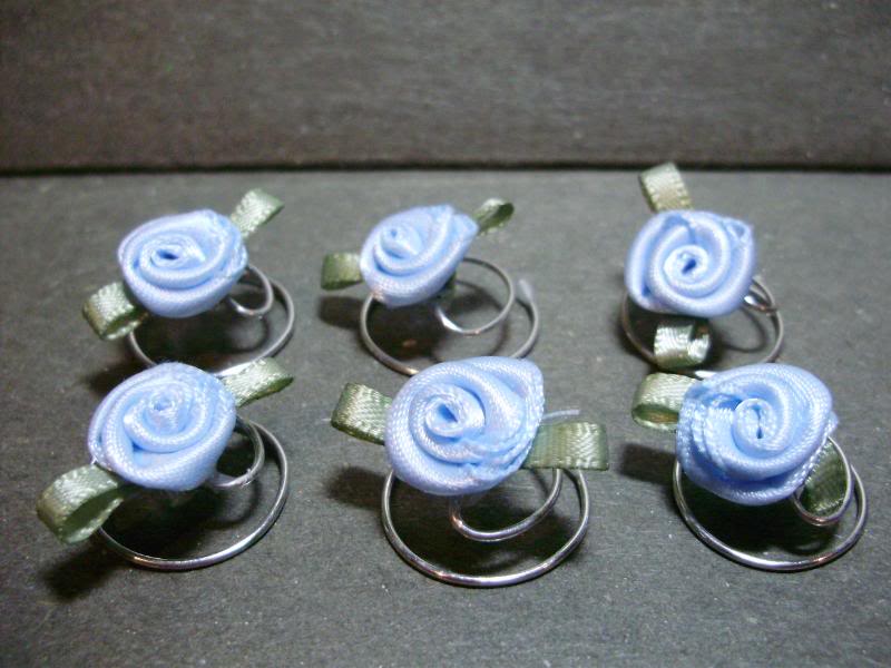 You are bidding on a beautiful set of 6 Light Blue Rose Hair Swirls. Each rose is about 1/2 inch in size. They are tiny and adorable. They would be perfect for the prom or a bridal party to match that blue dress.