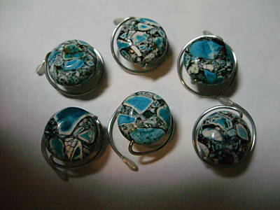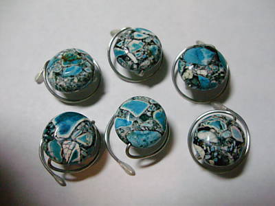 You are bidding on 6 beautiful aqua Howlite Stone twisties for the hair. They have colors of white, black and aqua blue in them. They would look gorgeous with a black or aqua dress. The perfect additon to your hair for that special look. They are mounted on shiny tarnish resistant silvertone wire. These measure about 1/2 inch across. If you need more than one set of these please email me or check out my ebay store.