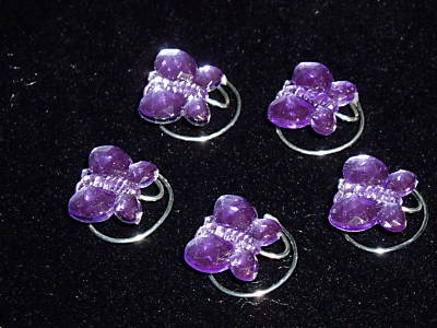 You are bidding on 5 amazing hair swirls consisting of beautiful sparkling purple acrylic butterflies. They are attached to a sturdy silvertone, tarnish resistant wire. Each one measures 3/4 of an inch. They give off a dazzling shine when light hits them. I guarantee it or your money back. This item cannot be sampled but if you are not satisfied for any reason you may return it for a full refund. Please check out my other auctions as i have many different designs and colors.