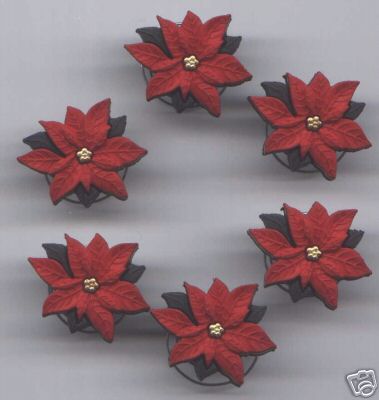 You are bidding on 6 pieces of hair jewelry consisting of adorable red poinsettias with a tiny gold tone center. . They would be perfect for a Christmas wedding party. They are about 1 inch long by 1/2 inch wide. These also come in white, cream, and burgundy. They will be perfect for the bride and bridesmaids.