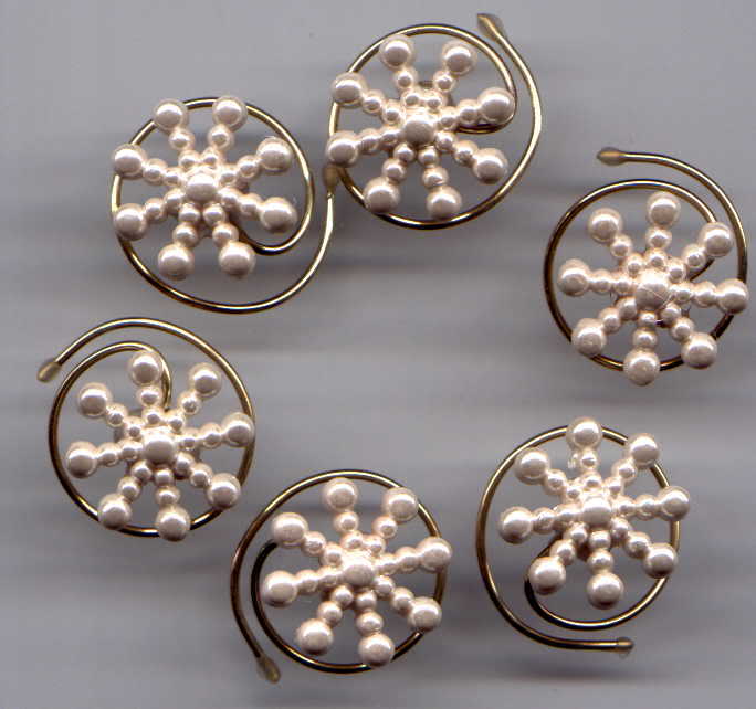 These are wonderful little hair twists, a remake of something I wore back in the sixties. They can be worn in short or long hair, but are perfect for upswept prom and bridal hairdos. They are simple to use (twist them to the left into the hair and out to the right), and very elegant to wear. When properly worn the wire should disappear and only the ornament will show in your hair. They all come in sets of six unless otherwise stated.
