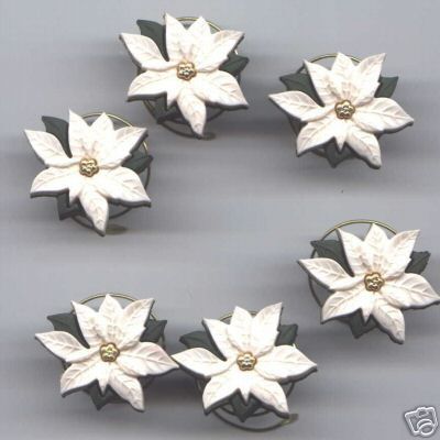 You are bidding on 6 pieces of hair jewelry consisting of adorable cream poinsettias with a tiny gold tone center. . They would be perfect for a Christmas wedding party. They are about 1 inch long by 1/2 inch wide. These also come in white, cream, and burgundy. They will be perfect for the bride and bridesmaids.