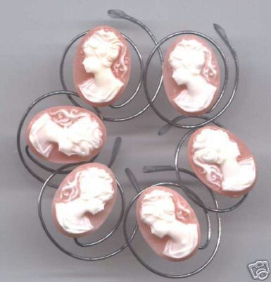 You are bidding on 6 pieces of hair jewelry consisting of beautiful acrylic white cameos on angel pink (light shell) backgrounds. They are 10x14mm(1/2 inch long by 3/8 inch wide) in size and absolutely precious. These would be beautiful for a bride.