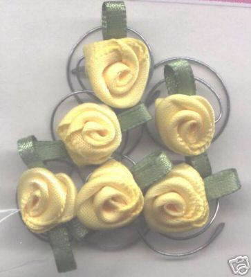 Perfect for prom, weddings, ballerinas, skaters, dancers, formals, or flower girls. You are bidding on 6 pieces of hair jewelry consisting of adorable little yellow ribbon roses. They are about1/2 of an inch wide. If you would like more than one set please ask. These come in lots of colors. Please check out my other auctions and my eBay store as I have lots of different designs and colors for every occasion.
