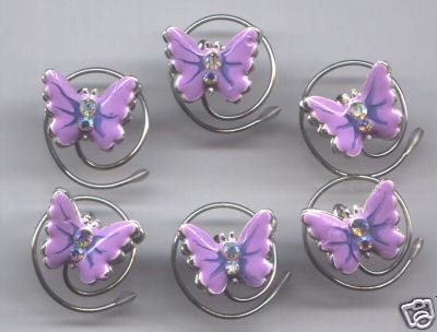 You are bidding on 6 beautiful purple enamel butterfly twisties for the hair. They have tiny Swarovski rhinestones in the center of the wings. They have shiny silver tone trim that make these very special. Their wings are double so they appear three dimensional as well. They are mounted on shiny tarnish resistant silver tone wire. These measure about 1/2 inch across. If you need more than one set of these please email me or check out my eBay store. These come in pink, white, green, blue and there is also a rainbow set. These have a spectacular shine even though the picture doesn't show it. I guarantee it or your money back. These come in lots of colors. Please ask for your favorite. Please check out my other auctions as I have many different designs and colors.