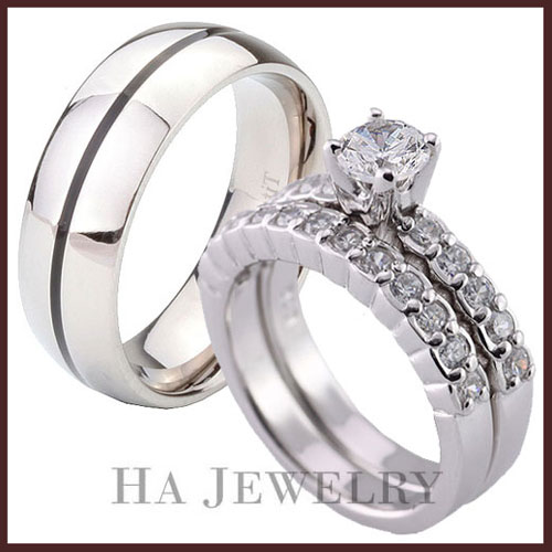 His Her Match Bridal Set. Stering Silver 925 Wedding Set with 2.4CT Cubic Zirconia For man's wedding band is about 8mm width Black Enamel Middle Dome Comfort fit Titanium Ring.