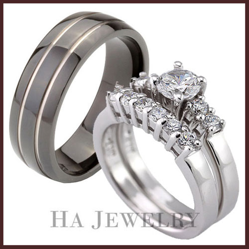 His & Her Matching set. Sterling silver wedding set ring with 1.13 carats brilliant cut simulated diamond. For man's wedding band is 7.0 mm width, Black Comfort fit Titanium Wedding Band with two line go around the band.