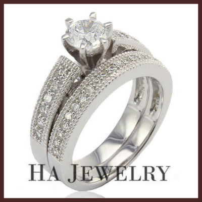This Matching Wedding Set Ring with 1.13carat AAA quality lab-created, 6-prong setting crown with 12 smaller round cut beside. There are 19 pieces round cut on the band, pave setting. Beautiful set has traditional handcrafted, perfect fit on your hand.