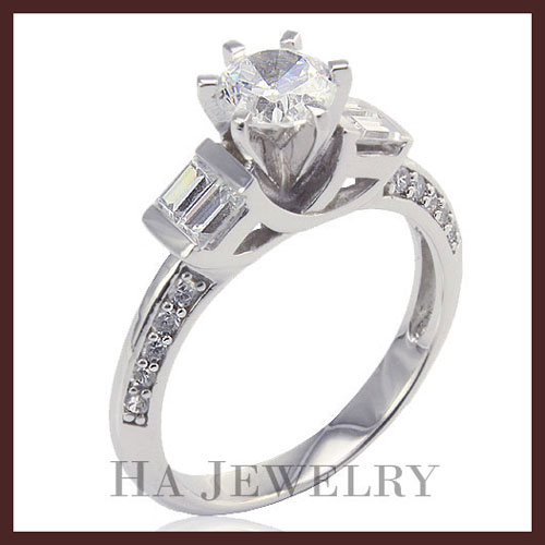 This Beautiful Ring features a 1.13 carat AAA quality lab-created round cut stone and 4 pieces of sparkle emeral-cut beside the major stone. There are smaller stones on the curve band. This ring is absolutely eye-catching, stunning, and Unique!