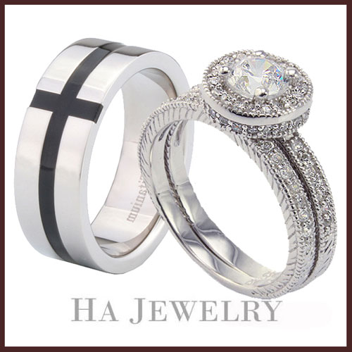This Beautiful Set Ring with a 1 carat AAA quality lab-created finish in Rhodium gives it platinium or white gold look. It beautiful Filigree work, Vintage Art. For men is a 8mm Titanium with two Black Enamel cross inlay in middle. Truly Amazing!
