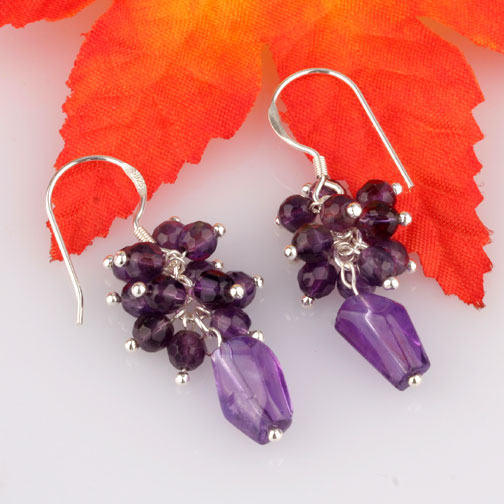 Cluster Natural Amethyst Dangle Drop Silver Earrings