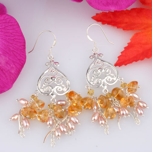 A stunning design pair of chandelier dangle Thai-Art(thailand) earrings, this pair of handmade earrings made of genuine free form citrine and freshwater pearl. The average stone measure 6-8mm attached on sterling silver chain dangle on handcraft sterling