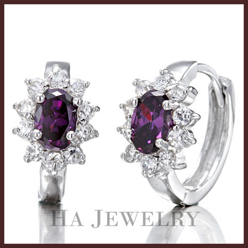 OVAL AMETHYST SIMULATED FLOWER SILVER HUGGIE EARRINGS