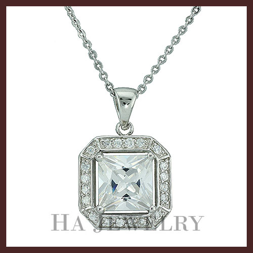 Princess CZ Sterling Silver Pendant Necklace Free Chain