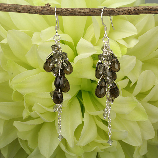 Made from Sterling silver wire ,Smoky quartzs & sparkle crystal. These pair of earrings are absolutely stunning with tones of sparkle and a wonderful color. Each stone can move freely and add extra sparkle.