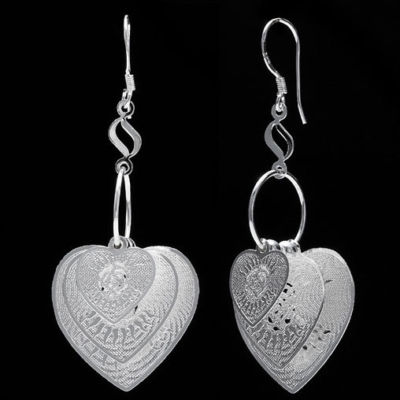 GRADUATED HEART "ROSE" STAMPING DANGLE SILVER EARRINGS