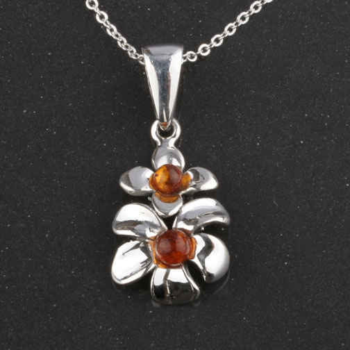Duo Flower Honey Amber Fine Silver Pendant Necklace 18"