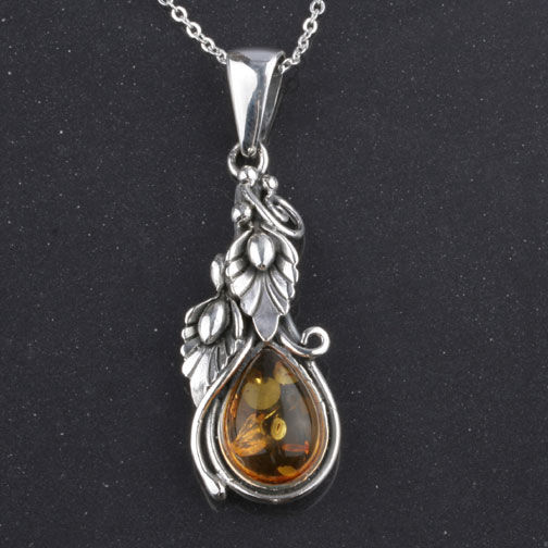 Natural Tear Drop Amber Flower Silver Pendant Necklace