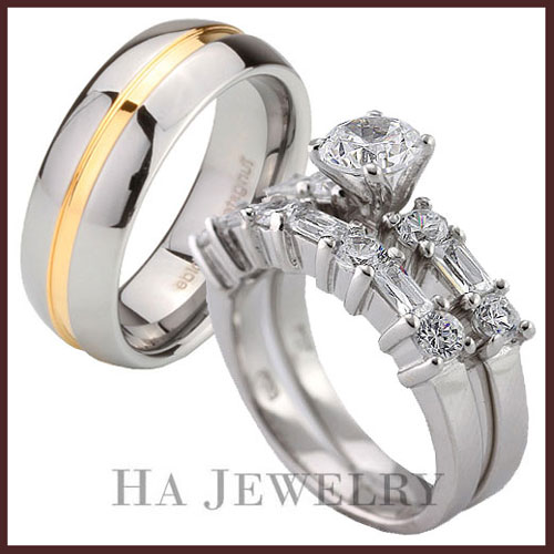 His Her Matching. 1.8CT Brilliant Cut Simulated Diamond Engagement Sterling Silver 925 Set Ring. For men is 8mm Tungsten **Cobalt-free** It is High Polish ,18K gold plated grooved center going all around the ring.