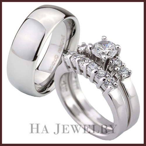 His & Her Matching set. Sterling silver wedding set ring with 1.13 carats brilliant cut simulated diamond. For men is 8mm Fantastic Dome Tungsten Carbide, Cobalt-Free, High Polish finish.