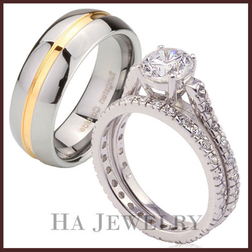 Men Matching Set 2 Rings.3.2CT Silver 925 Simulated Diamond Stunning Stackable Wedding Set Ring For men is 8mm Tungsten **Cobalt-free** It is High Polish ,18K gold plated grooved center going all around the ring.