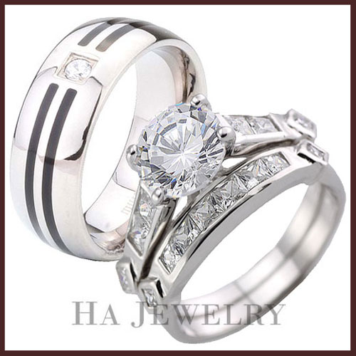 Matching Set 2 Ring. 4.8CT Simulated Diamond Sterling Silver 925 Wedding Set Ring For man's wedding band is 8mm width, 2.5mm round CZ approx. 0.1 carat double line Black Enamel Comfort fit Titanium Ring.