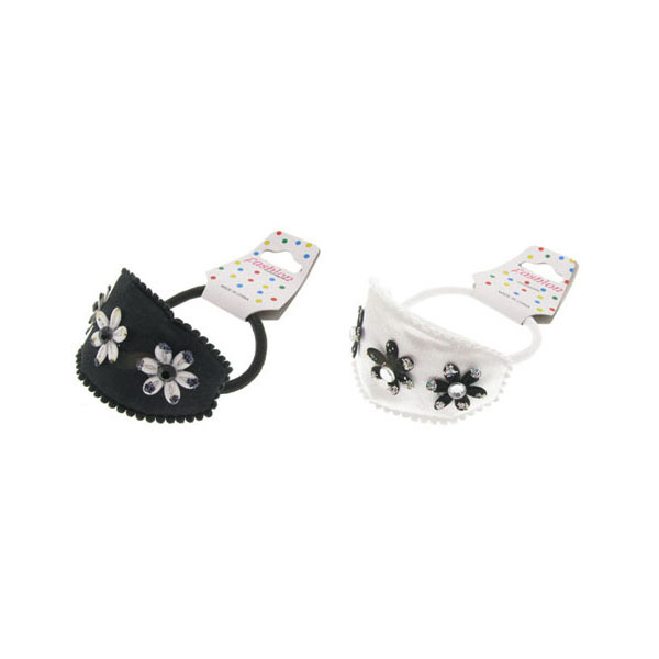 "Dressy black and white pony o's with glitter accented fabric flowers, individually carded for display." Case Pack 60