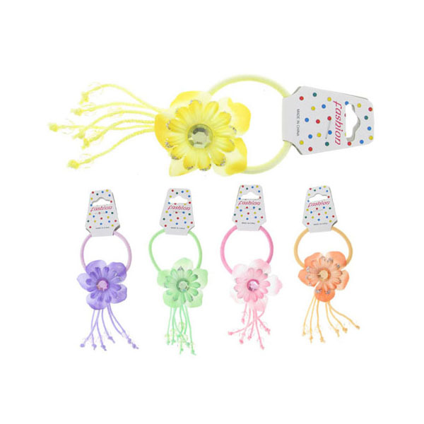 "Children's Ponyo, assorted color cloth flowers, with a crystal accent bead and sparkley dangles, on a coordinating band. Colors include: purple, pink, yellow, orange, green, and blue." Case Pack 60