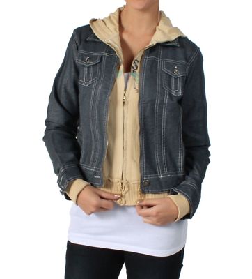 This denim jacket is lined with a tan brown hoodie. The inside hoodie and denim jacket both zip up, and it contains two buttoned pockets in the front.
