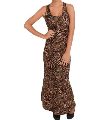 This dress is printed with a mixture of cheetah, leopard, and tiger print. This dress comes down to 53" in length and has a racerback back. Made up of a comfortable, yet formfitting material, look chic with this maxi dress, a sunhat, and your favorite over-sized sunglasses.