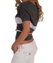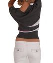 This cropped sweater is simple and fashionable with a buttoned left sleeve and thick stripes on the body with a scrunched bottom.