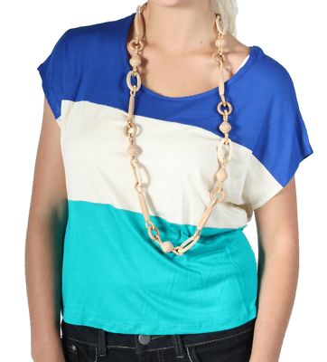 With splashes of royal blue and vibrant aquamarine, this loose fit top can liven up any outfit. Each color block is 6.5" thick and the scoop neck is wide enough to show off your collar bones. Pair this with a pair of cut off shorts and flip flops to complete your go-to beach outfit.