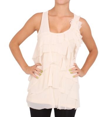 This top is decorated with tiers of fringes made from chiffon. The fringes start at the left shoulder at 1.5" in length and grow in size towards to hem of the top. This delicate top comes in a versatile color and can be matched with your favorite dark denim skinny jeans or with a pair of boldly colored leggings.