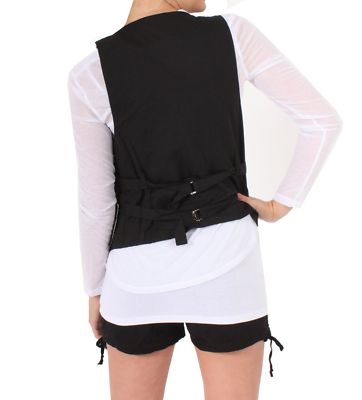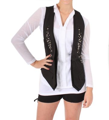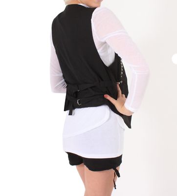 Decorated at the front with gunmetal colored mini baubles and scattered matte antique gold colored sequins. This vest is closed with three .75 fabric covered buttons at the waist. With flaps at the hem of this vest, and two straps to tie it up in the back, this vest is cut to look very professional but has additions that are great for out of the office.