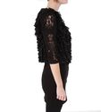 This festive vest can liven up any outfit. This vest is covered from shoulder to hem with 2" thick ruffles that alternate with plain and gunmetal studded chiffon inspired material. With 19" armholes, this vest is meant to be worn loosely over an outfit with or without the hook and eye closed.