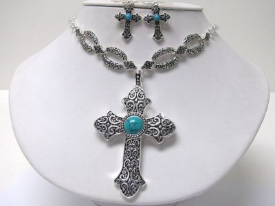 CHUNKY TURQUOISE DECO CROSS PENDANT NECKLACE SET