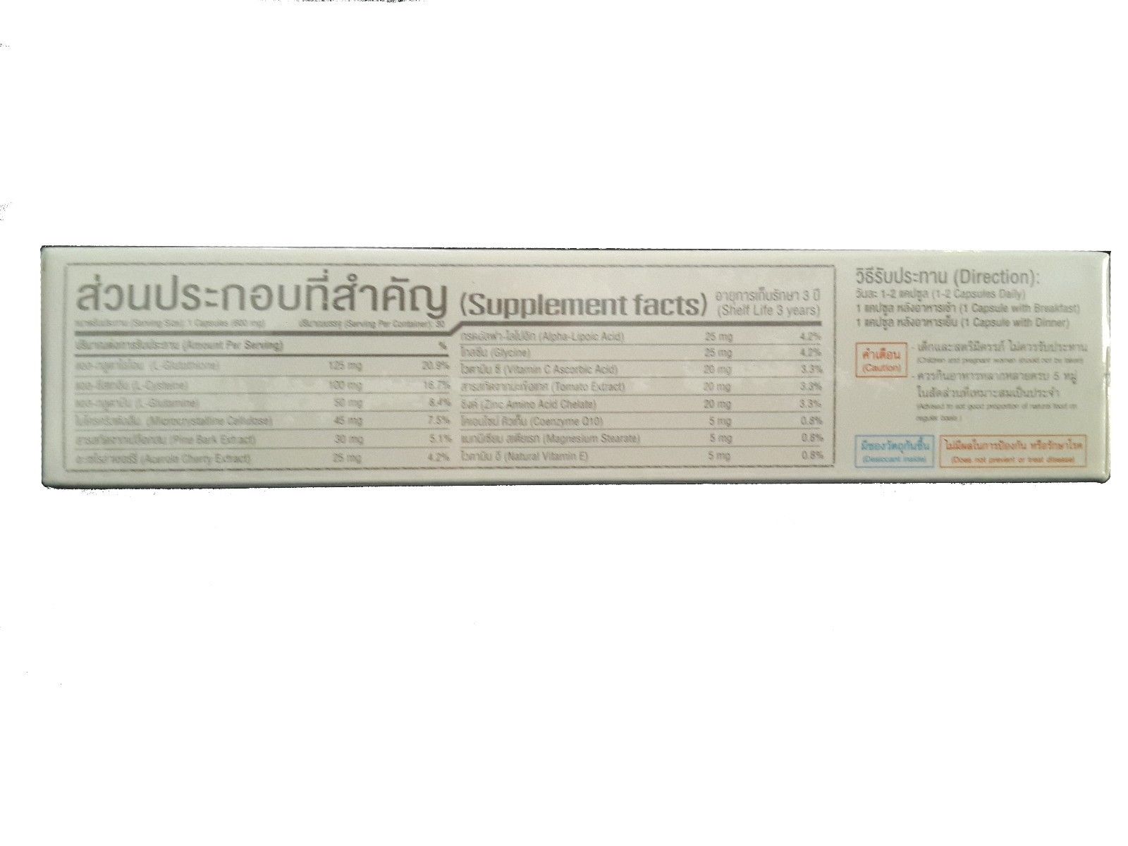 Ingredients : - L-Cystein 100mg. - L-Glutamine 50mg. - Microcrystalline 45mg. - Extract from pine bark 30mg. - Acerola cherry 25mg. - Alpha-lipoic acid 25mg. - Glycine 25mg. - Vitamin C 20mg. - tomato Extract 20 mg. - Zinc 20 mg. - Coenzyme Q10 5 mg. - Magnesium 5 mg. - Vitamin E 5 mg. How to Apply : Take 1-2 Capsules Daily 1 Capsule with Breakfast 1 Capsules with Dinner Terms &Conditions
