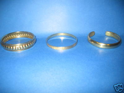 THE LOT CONTAINS TWO BRASS AND ONE GOLD PLATED BRACELETS.