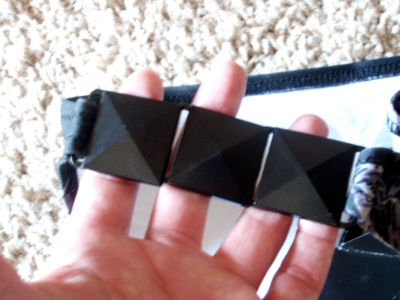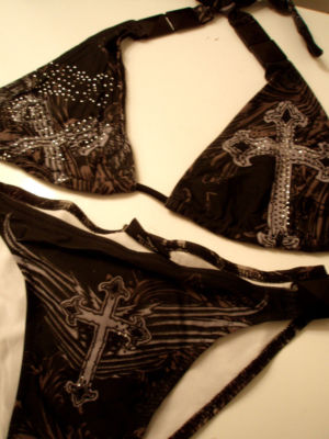 This is a Black and Lavender Bikini adorned with crystals and crosses. Sides have black metal pyramid links as shown in photo.