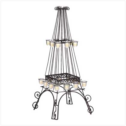 Eiffel Tower Candleholder Ooh la la! This stately wire-sculpture candleholder brings a touch of Parisian elegance to your very own home; artistically fashioned after France's famous landmark. Metal wists and curlicues form a gracious support for two glowing tiers of candles esconced in gleaming clear-glass cups for a glorious glowing display. At a generous 45" high; this is one object d'art that's guaranteed to impress! Metal with glass cups. Holds 20 candles total (not included). 20" x 20" x 45" high.
