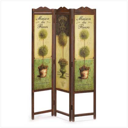 Country French Divider Screen Instantly add the genteel charm of a French chateau to your favorite sitting area! Three-panel room divider features a rich wood frame and nostalgic screened canvas floral graphics. Double-sided graphics; can be folded into many different configurations. Wood and canvas. May Require Additional Freight Charge. 47 1/2" x 1 3/4" x 70 3/4" high.
