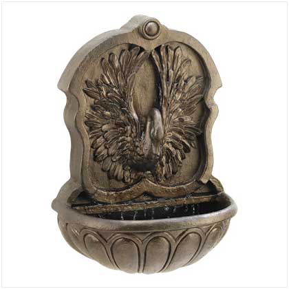 Crystal water creates a gentle sound, streaming from above the outspread wings of a graceful swan. This tasteful wall fountain adds classic elegance to your surroundings. Lightweight resin fountain exactly resembles cast bronze for an opulent look!