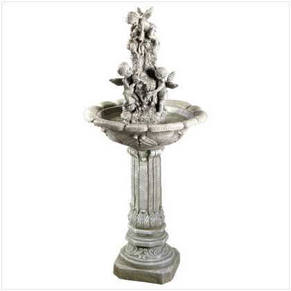 Playful cherubs send a cascade of water down the center of this classically designed fountain. In home or garden it will invite serenity. Alabastrite. Pump included. UL Recognized. 19 1/2" x 9 1/2" x 42" high.