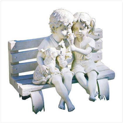 Sculpture of children and their dog eating ice cream on a bench. Alabastrite. May require additional freight charge. 19 1/2" x 11 1/4" x 19 1/2" high.