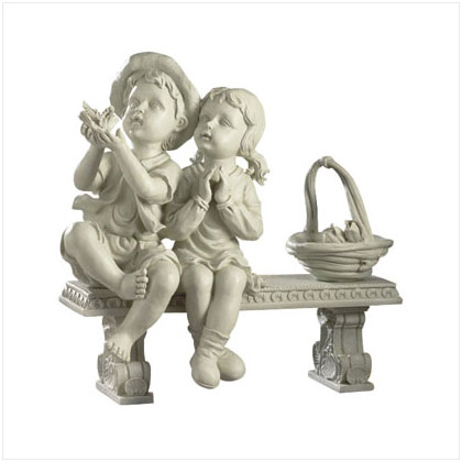 This garden sculpture featuring a boy and girl seated on a bench makes a fetching display for any landscape. Alabastrite. 20 1/4" x 11 1/2" x 21 1/4" high.