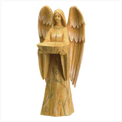 Angel Birdfeeder A kind-hearted angel offers refreshment to hungry feathered travelers. Tall; slender figurine is enchantingly enlivened by a twining leaf-and-vine design; durable stone/resin blend looks just like hand-carved wood! May require additional freight charge. 9 3/4" x 9 1/2" x 20" high.