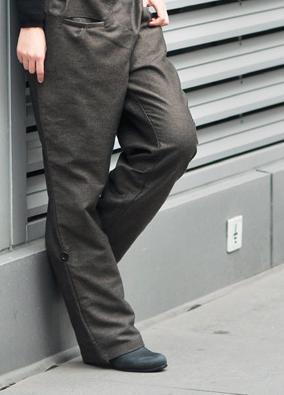 The bottom of the pants can be adjusted to shorten by 18cm by folding the bottom hem and securing with the short strap and button on the side -as you can see the button visible in photo 2.