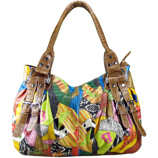 Front Belt Bright Animal Patch Leather Tote Handbag - Measurements: 10"H x 18"W