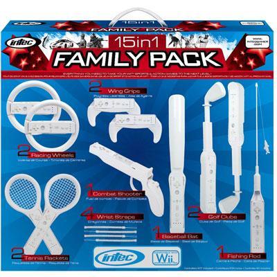 15-in-1 Family Pack... The Intec 15-in-1 Family Pack takes sports & action games to the next level. The pack contains 15 remote attachments to play with your favorite Wii sports and action games. Simply secure your remote into the base grip, hook on the attachment and start playing. Includes 2 Racing Wheels, 2 Tennis Rackets, 2 Golf Clubs, 2 Wing Grips, 1 Combat Shooter, 1 Baseball Bat, 1 Fishing Rod and 4 Wrist Straps!